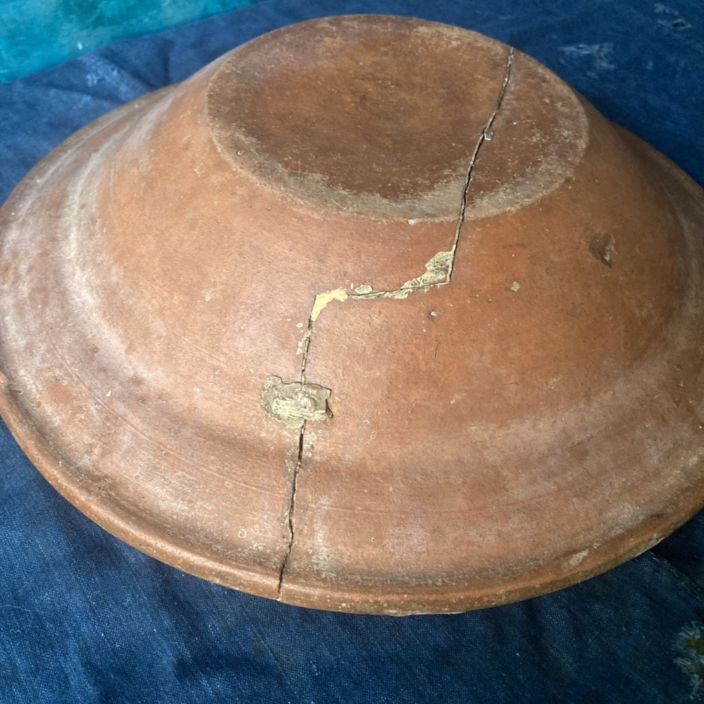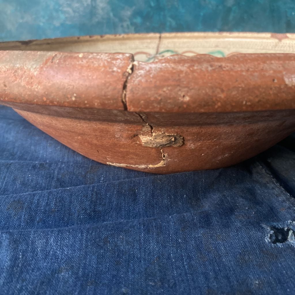 直径約33.5cm、高さ約9cmと、当時の食卓で主役を張っていたであろう堂々としたサイズ感です。数カ所のチップや、長い年月を経て施された修復跡(古い金継ぎのような手法の可能性も)は、このボウルが大切に使われてきた歴史の証であり、唯一無二の存在感を放っています。