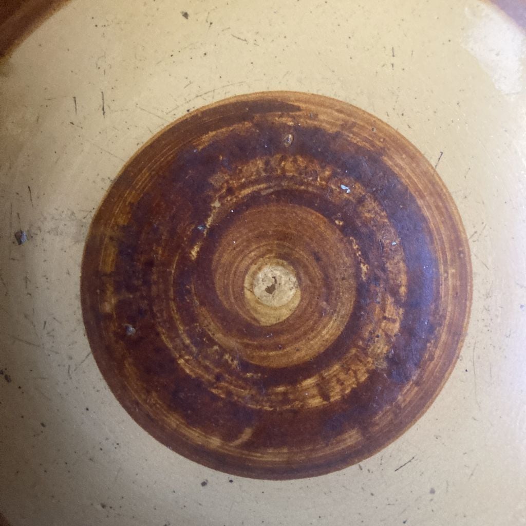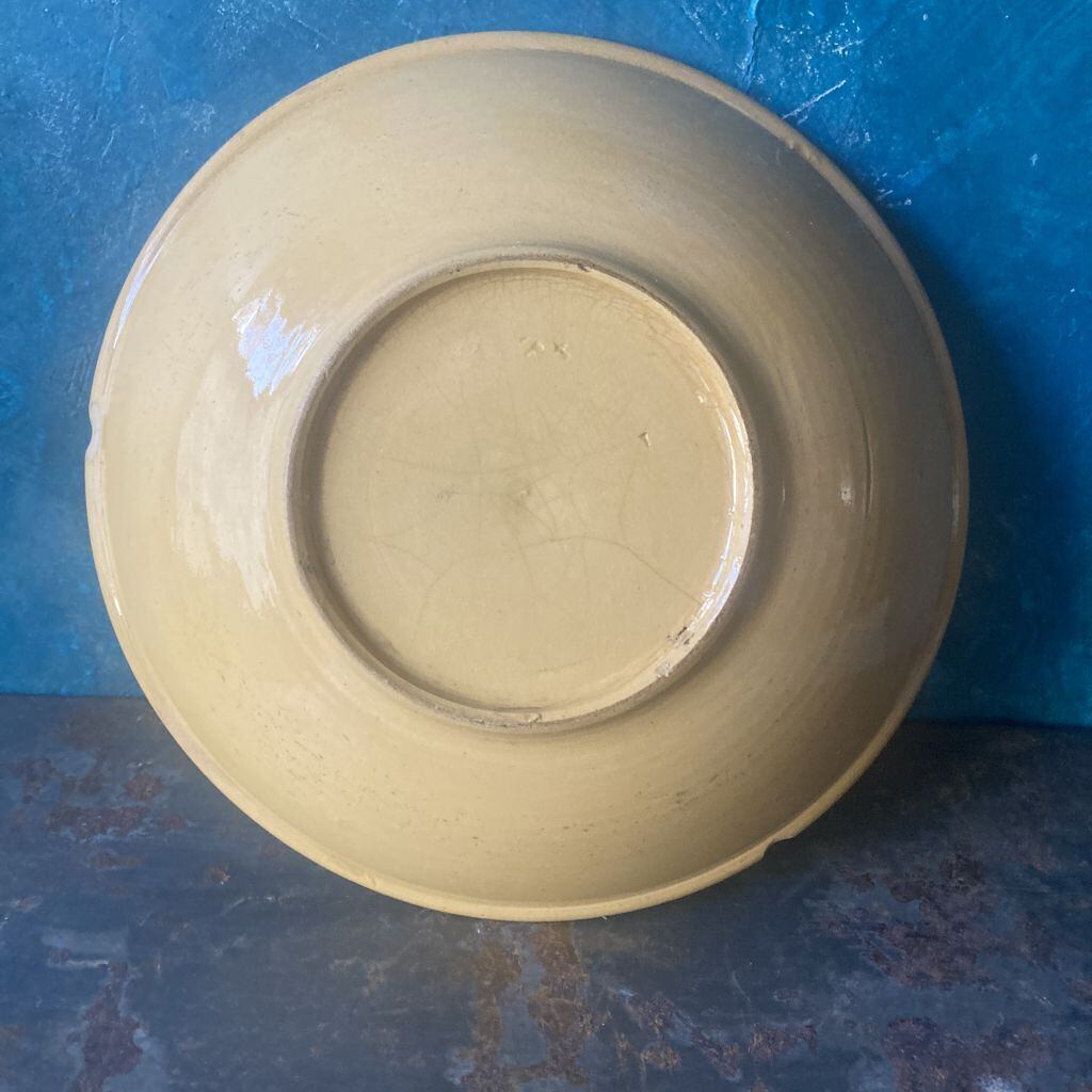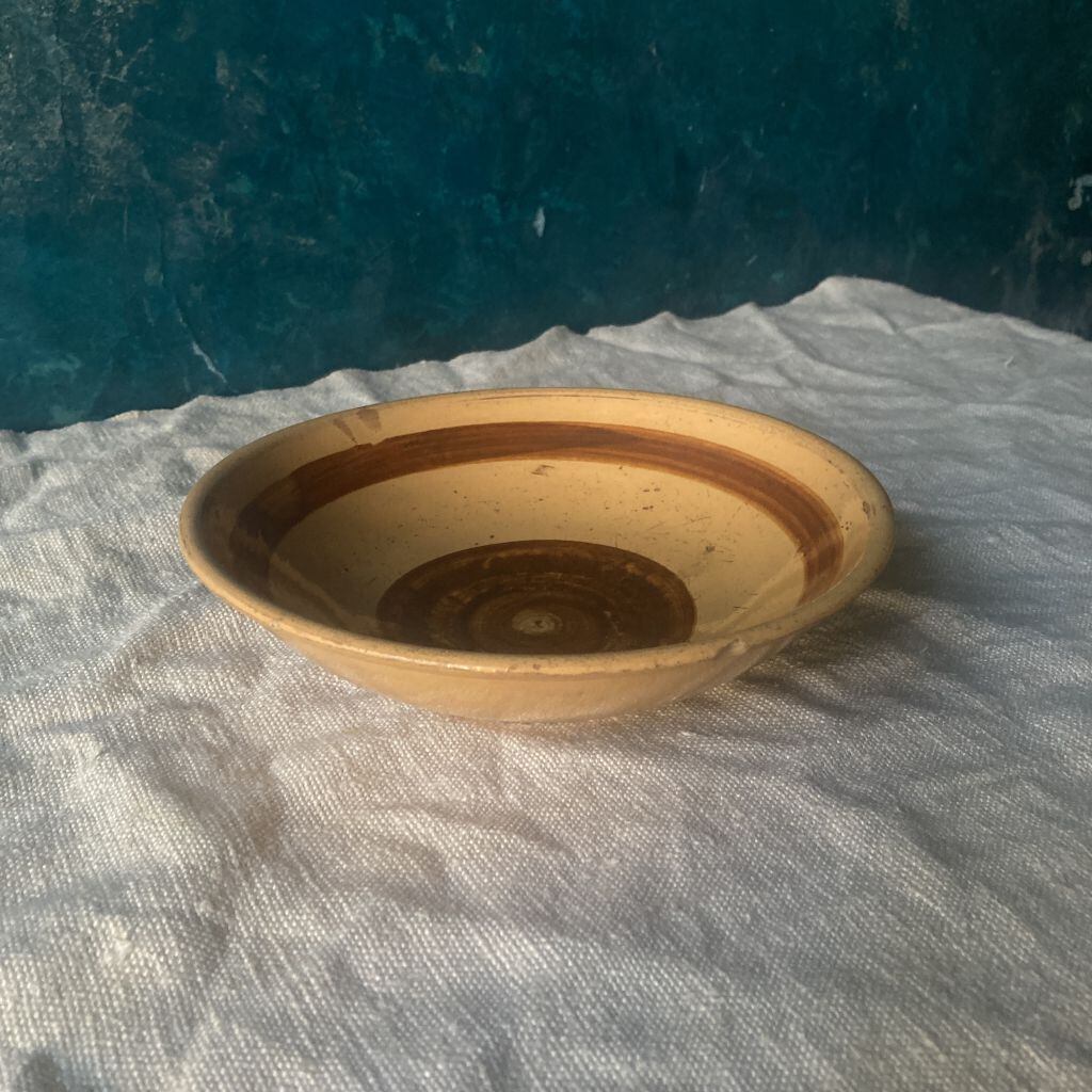 このボウルは、特に希少な「Tillinge Fayence」(1858-1868年)で製造されたものです。温かみのある黄色いファイアンスに、手描きの素朴なストライプと中心の渦巻き模様が、時代を超えた魅力を醸し出しています。北欧の厳しい自然の中で育まれた、人々の暮らしに寄り添う工芸品の温かさを感じさせる逸品です。
