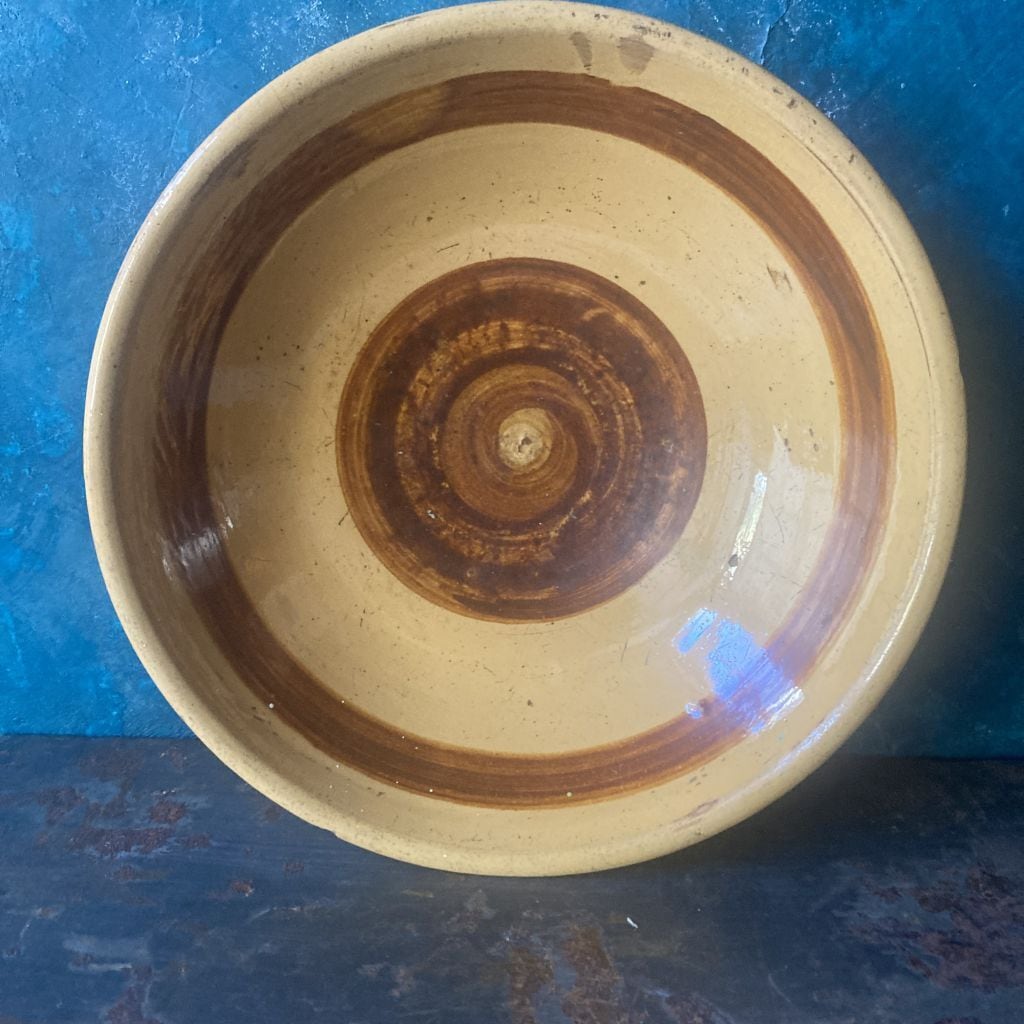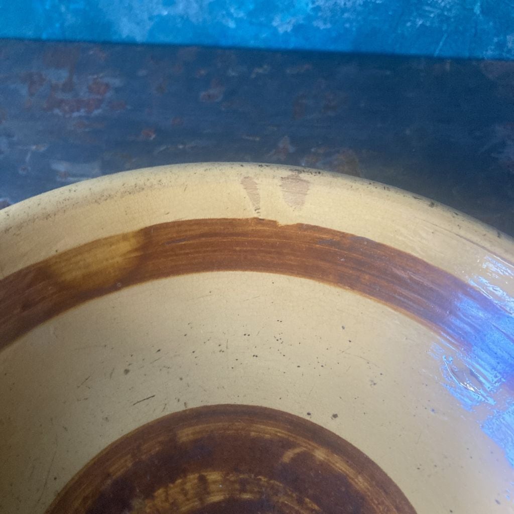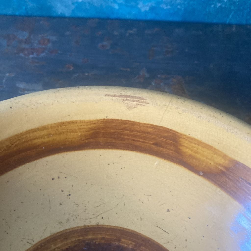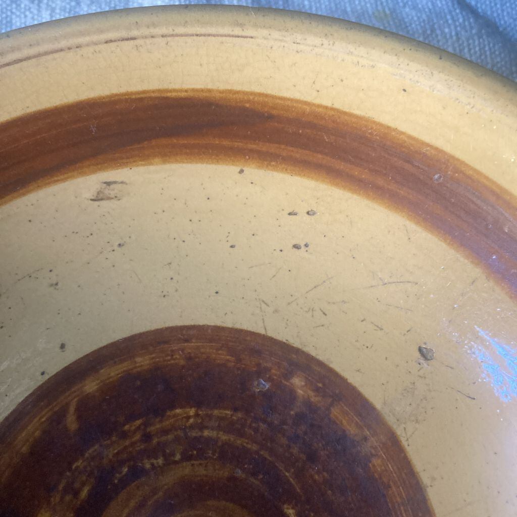このボウルは、特に希少な「Tillinge Fayence」(1858-1868年)で製造されたものです。温かみのある黄色いファイアンスに、手描きの素朴なストライプと中心の渦巻き模様が、時代を超えた魅力を醸し出しています。北欧の厳しい自然の中で育まれた、人々の暮らしに寄り添う工芸品の温かさを感じさせる逸品です。