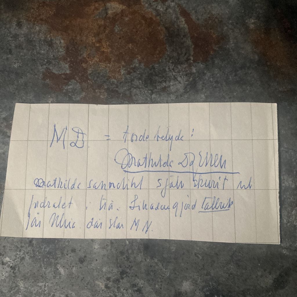 付属していたメモには、「MD Mathilde (Dは判読不明な何か)。マティルダ自身が、おそらくこの木製ケースを彫った。同じように作られた皿(先にウェブショップにアップしたMNのプレート)はその一年前に彫られMNとサインされていた」と記されています。