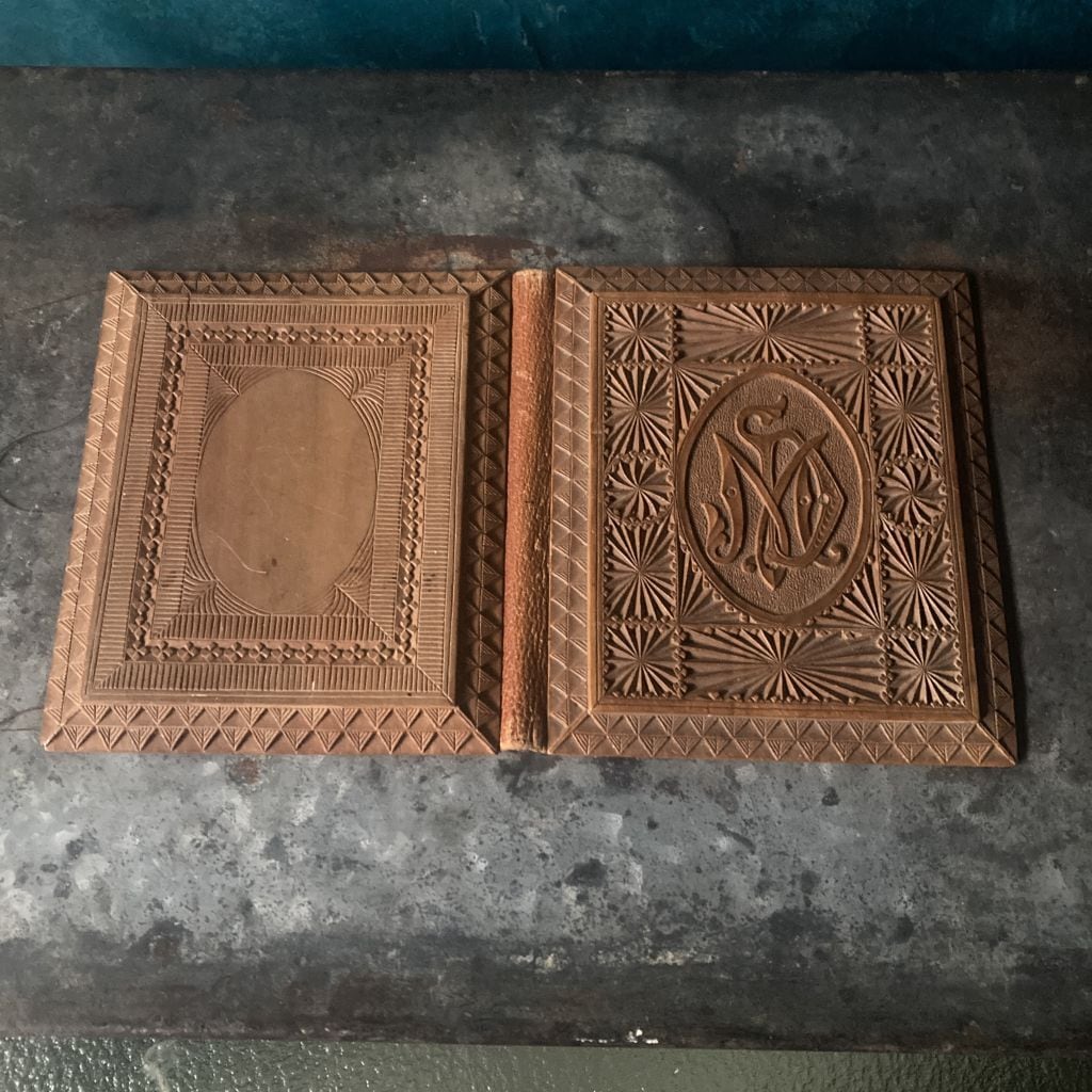 このケースは、2枚の長方形の木片を革で繋ぎ合わせ、まるで古い本のような装丁になっています。表面全体には、スウェーデン伝統の**チップカービング(切り込み彫り)**による緻密な幾何学模様が施されており、その技量の高さがうかがえます。