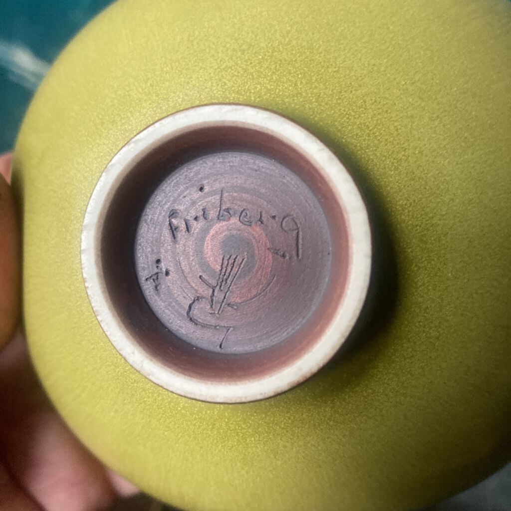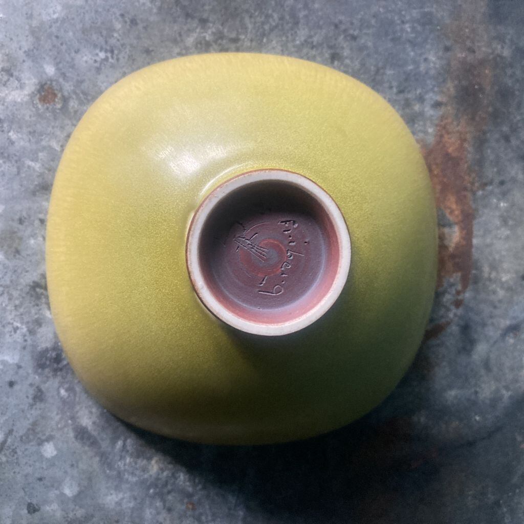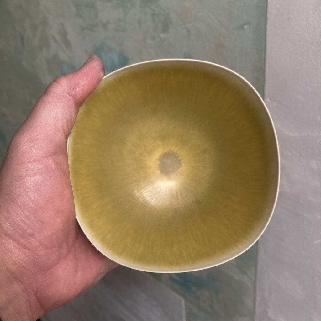 釉薬が溶け込んだ内側中央には、濃淡のコントラストが生まれており、光の当たり方によって、金色から微かにグリーンやグレーを帯びた複雑な表情を見せます。