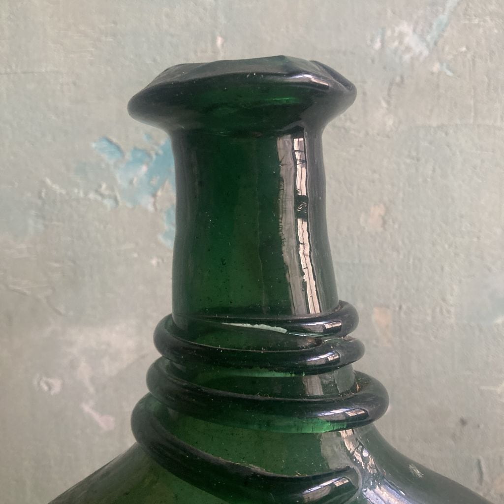 最大の特徴は、首元に力強く巻き付けられたガラスの螺旋(スパイラル)装飾。これは単なるデザインではなく、かつて砂漠を旅する際、革紐やストッパーをしっかりと固定し、駱駝や馬の鞍(サドル)袋から貴重な水分やワインがこぼれ落ちないようにするための実用的な工夫でした。