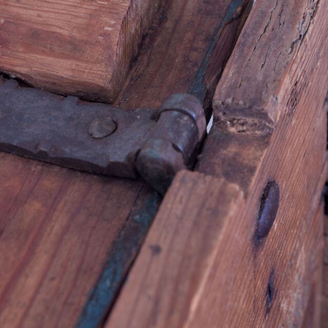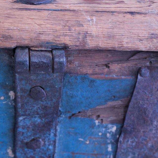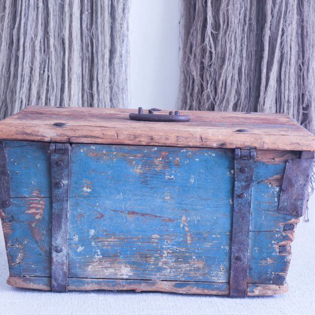 スウェーデンの18世紀頃のアンティーク宝箱。直しと虫食い跡があります